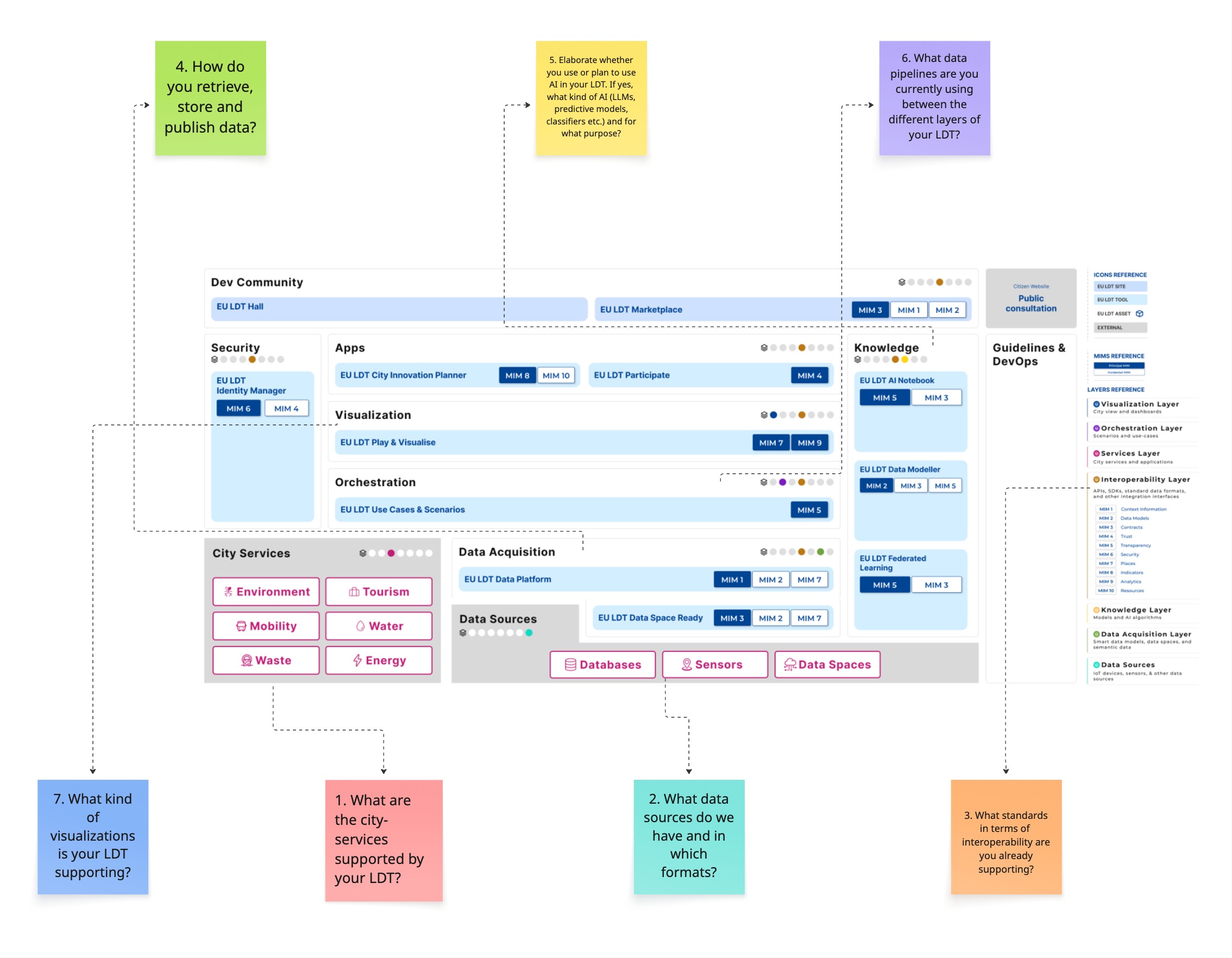 The diagram above illustrates the different layers and tools of the EU LDT Toolbox. Each sticky note at the border of the diagram links a question about your existing LDT with the relevant layer of the EU LDT Toolbox. Answering these questions provides a structured starting point for further elaboration of a gap analysis, helping to identify areas where alignment with the toolbox is needed.